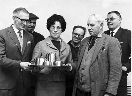 | Mr S. J. Hobbs chief clerk, welding department, Redcar works, was presented with a silver tea service to mark his retirement after 50 years service at Redcar works, by Mr H. M. Thomson, department manager on behalf of his colleagues. Mr Hobbs who in 50 years only missed two days off work, began as a stores assistant at the blastfurnace department in 1919, and joined the clerical staff five years later. Between 1931 when he was transferred to the steelworks traffic office and 1958 when he joined the welding department, he served in the cost department and for further periods at the blastfurnaces. He has been a member of Coatham Parish Church choir for 47 years, and is a member of the works ambulance crops.